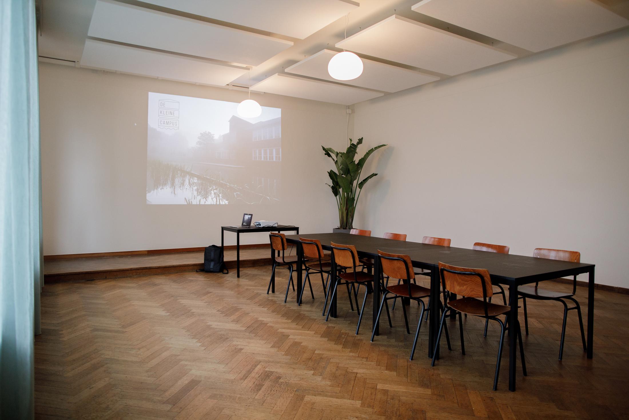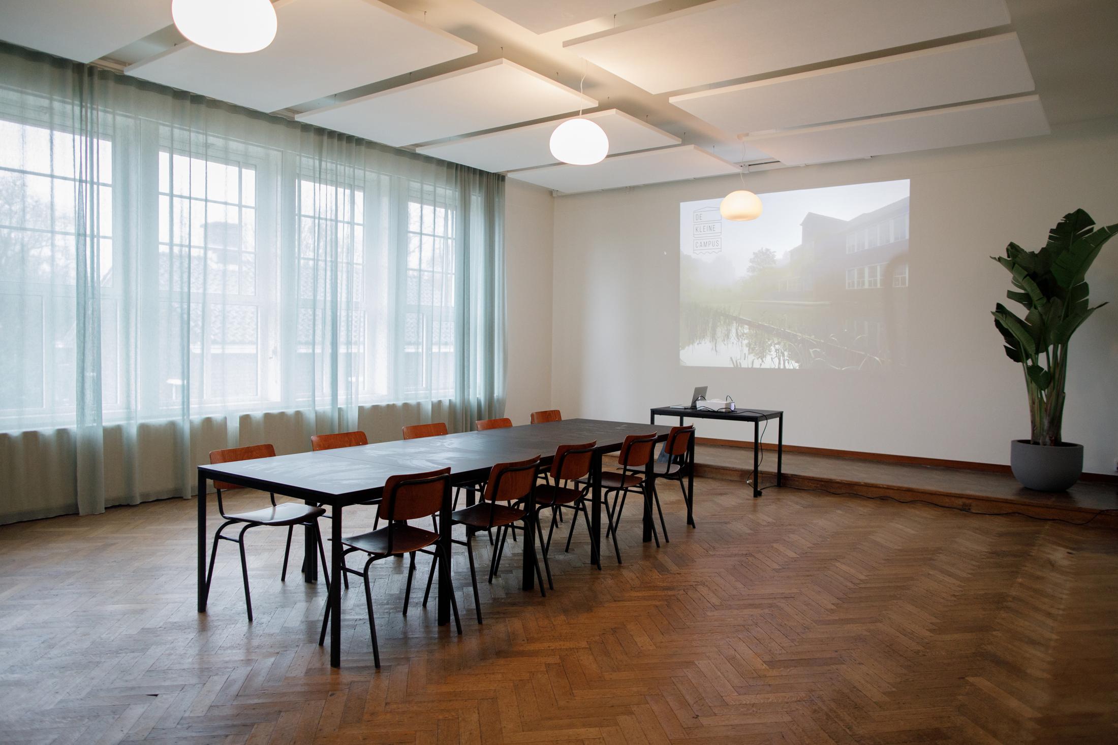 De Grote Vijverkamer bevindt zich in een rustig gedeelte van het schoolgebouw en het houten parket, de akoestische panelen en dubbele gordijnen zorgen voor een prettige akoestiek. De ruimte heeft een projectiewand en kan verduisterd worden – op verzoek kunt u een beamer of flip-over huren.