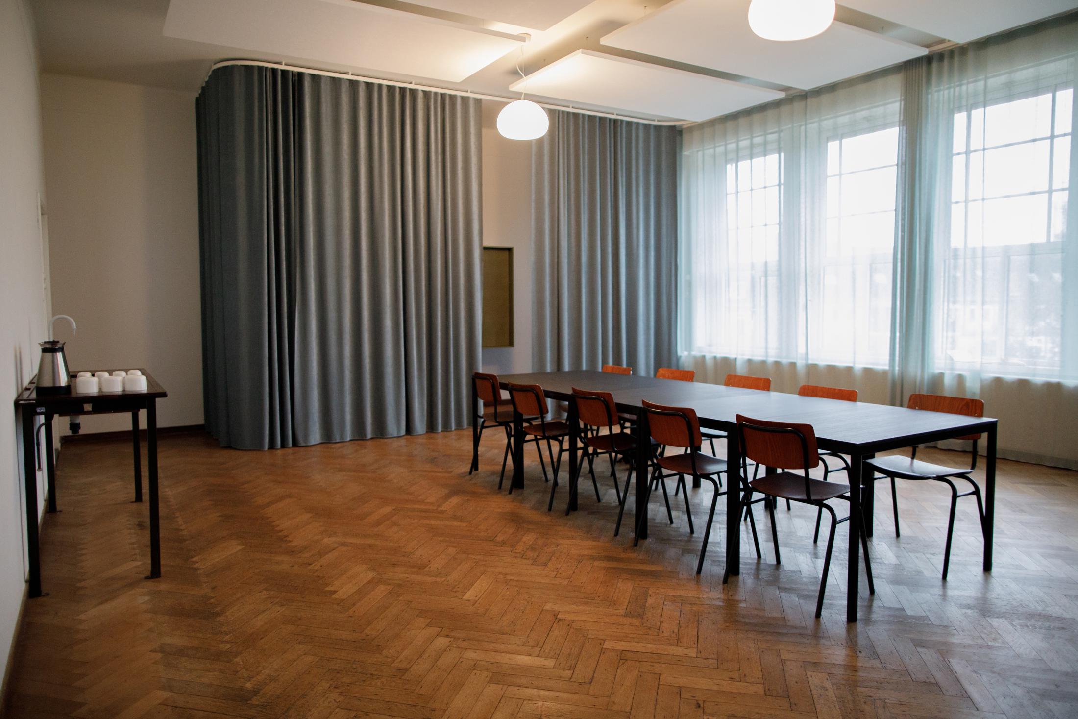 Een hoge, lichte ruimte voor besprekingen met 8 tot 20 personen. De ruimte kan naast vergaderen ook gebruikt worden voor workshops, lezingen of trainingen. In overleg kan de ruimte ingericht worden met werktafels of een presentatie-opstelling.